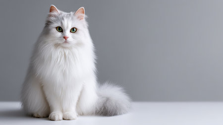 A serene image of a fluffy white cat with captivating green eyes, perfectly positioned against a soft gray background, capturing tranquility and beauty in a minimalist setting.