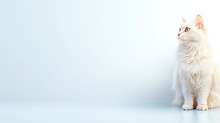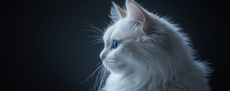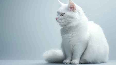 A serene profile of a white longhair cat, sitting gracefully against a soft, minimalist background. Perfect for capturing the essence of calmness and elegance.