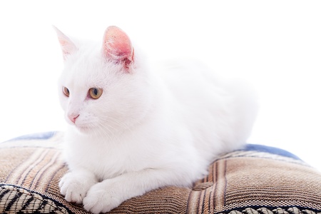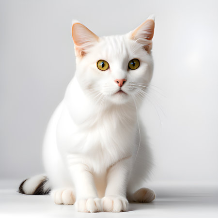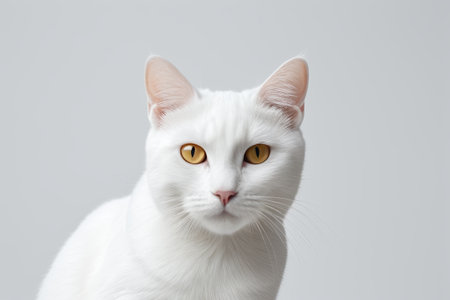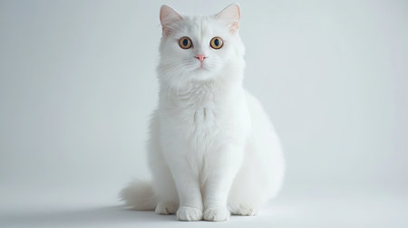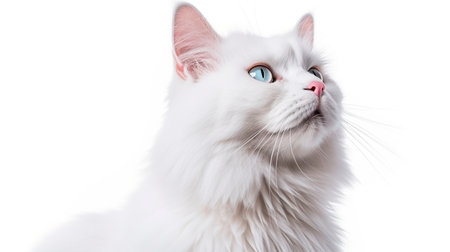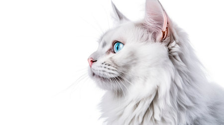Elegant Pure White Turkish Angora Cat with Stunning Eyes and Enchanting Expression on White BG