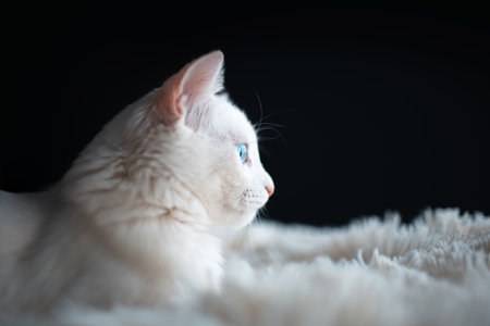 Close-up side portrait of white cat with blue eyes lying on fluffy plaid, on black background.