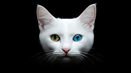 A captivating close-up of a beautiful white cat showcasing its vibrant green and blue eyes against a dark background, highlighting its unique features.