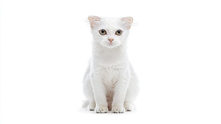 A serene white cat with curled ears sits gracefully against a white background, showcasing its fluffy fur and expressive gaze. Perfect for cat lovers.