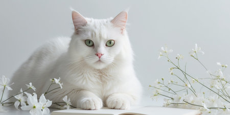 AI Generated. Serene White Cat and Blank Notebook Surrounded by Delicate White Flowers