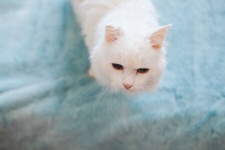 White cat with different color eyes looking up at camera on white bed. Turkish angora with blue and green eye. Adorable domestic pets, heterochromia.