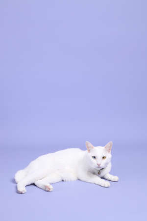 A captivating portrait of a fluffy white cat with enchanting orange eyes, resting gracefully on a simple background. Ideal for animal lovers.