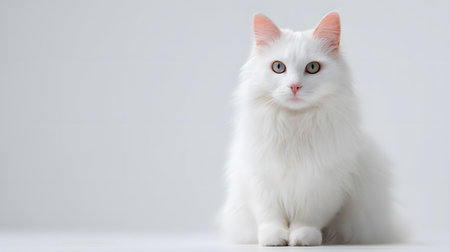 This striking image features an elegant white cat sitting calmly against a minimalistic background, capturing its soft fur and expressive eyes with serene grace.