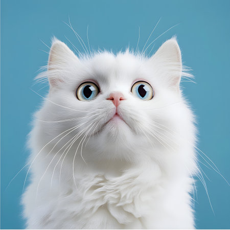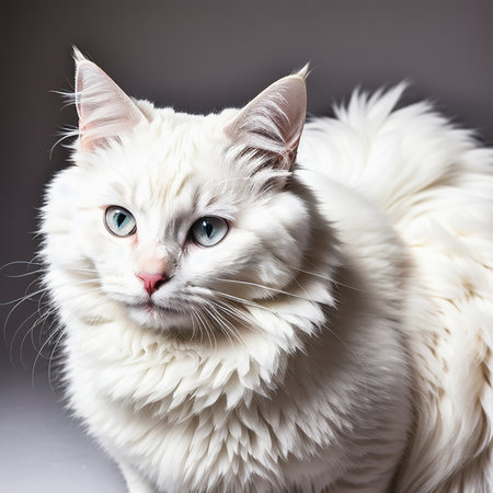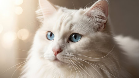 A close-up portrait presents a fluffy white cat with striking blue eyes, illuminated by soft, diffused lighting. The image showcases the cat's fur texture and facial details. Suitable for various applications, this image can be utilized in editorial content or promotional materials.