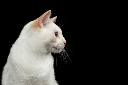 Close-up Portrait of Mekong Bobtail Cat with Blue eyes in Profile view, Isolated Black Background, Color-point White Fur