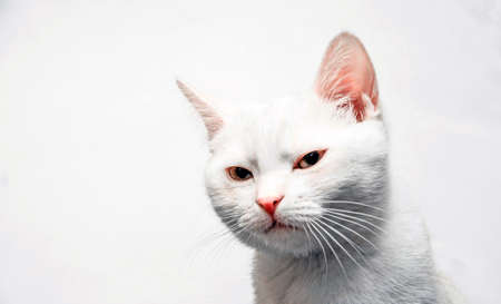 Beautiful portrait of a white cat with blue eyes and pink nose isolated on a white background.