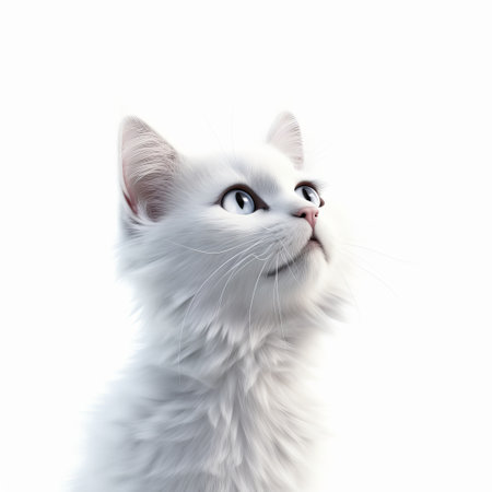 a white kitten gazes upwards, capturing the viewer's attention with its innocent curiosity. rendered in stunning 8k resolution using octane render, this image showcases precise detailing and a glossy finish. the soft mist adds a touch of ethereal beauty, enhancing the intricate character design. this portrait exemplifies the expertise of an object portraiture specialist. ai generated