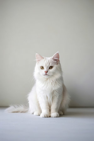 This charming image features a fluffy white cat sitting gracefully in a bright, clean studio. The cat gazes curiously, showcasing its beautiful blue eyes in a serene setting.