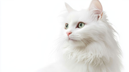 Turkish Angora Cat Portrait with Fluffy White Fur and Emerald Eyes on a White Background