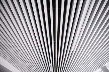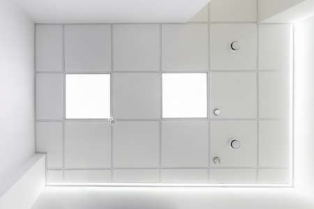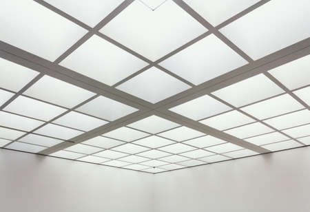 multi-level ceiling with three-dimensional protrusions and a suspended tiled ceiling white color, close up unlabel details.