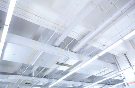 Ceiling mounted cassette type air conditioner and modern lamp light on white ceiling. duct air conditioner for office or home