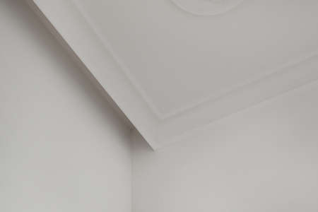 corner of ceiling and walls with intricate crown moulding. Interior construction and renovation concept.