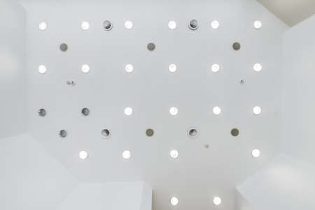 cassette suspended ceiling with square halogen spots lamps and drywall construction in empty room in apartment, clinic, office or house. Stretch ceiling white and complex shape. Looking up view