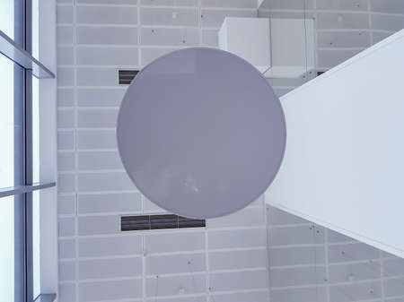 Bright rays pour through a circular skylight, illuminating a smooth, plain surface. The environment feels serene and modern, inviting a sense of calm and simplicity.