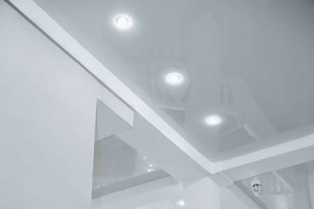 suspended ceiling with halogen spots lamps and drywall construction in empty room in apartment or house. Stretch ceiling white and complex shape.