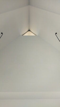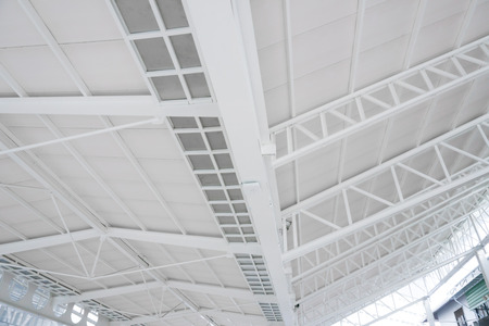 The view showcases a spacious ceiling with an intricate design, featuring large windows that allow ample natural light to flood the interior.