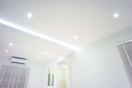 LED strip light and illumination. Also called ribbon light or LED tape to suspended on ceiling in plasterboard in empty living room include down light, white wall. Interior home design and technology.
