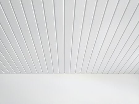 Perspective of white wood sheeting ceiling and smooth white wall in Caribbean construction. White ceiling beams pattern background.