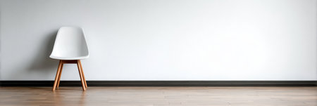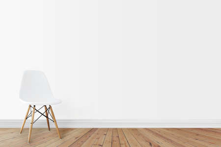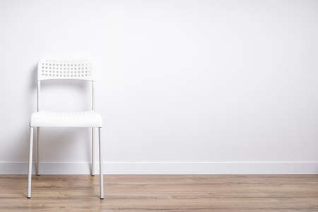 White plastic chair with wooden legs stands against a light gray wall in a minimalist room with light beige hardwood flooring. A white baseboard runs along the wall, creating a clean, simple interior scene.