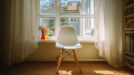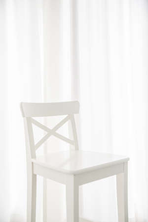 A white chair sits centered before a window, with sheer curtains framing the view. Soft sunlight streams through, illuminating the interior space. Colors include white, tan, and shades of wood. The composition provides copy space for commercial projects and is suitable for lifestyle or interior design themes.