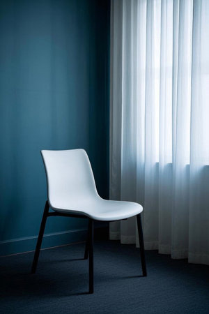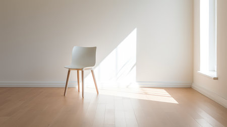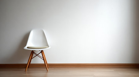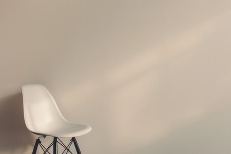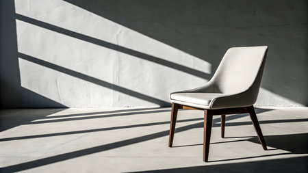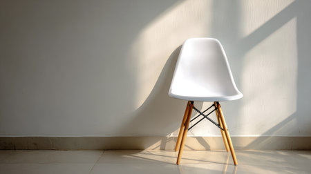 A minimalist white chair stands alone in a modern interior, casting soft shadows on the wall and floor, evoking a serene atmosphere ideal for contemporary design settings.
