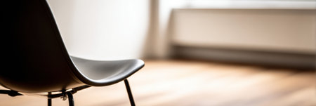 A sleek black chair stands in a well-lit space, showcasing minimalistic design against warm wooden flooring, inviting relaxation and calmness.