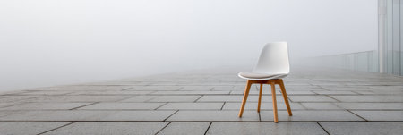 A single white chair stands on a modern terrace, surrounded by dense fog that obscures the distant scenery during a calm morning.