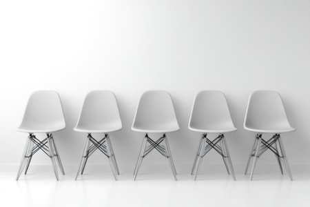 In the picture, a line of identical white chairs is placed next to each other. The chairs are arranged neatly, creating a sense of order and symmetry. The chairs appear to be unused and are situated in an indoor setting. Each chair is identical in design and color, adding to the uniformity of the row.