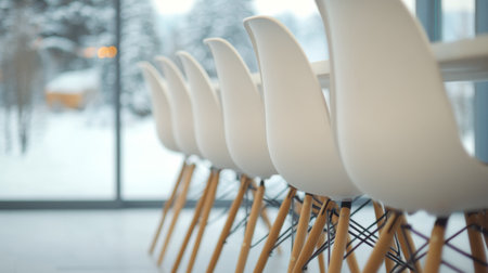 White chairs are arranged neatly in a contemporary indoor setting, providing a cozy atmosphere as snow falls outside the large windows, creating a serene winter backdrop.