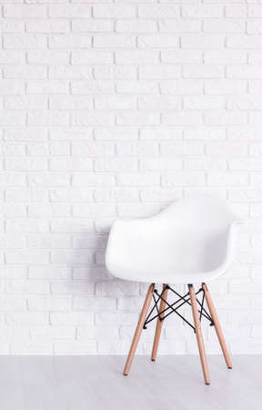 Minimalist white chair with wooden legs in bright room, modern design interior
