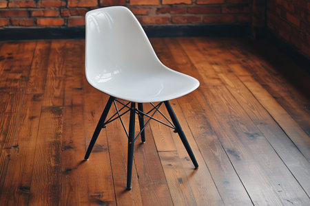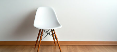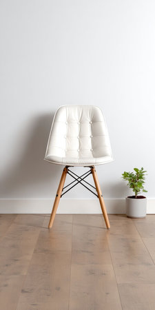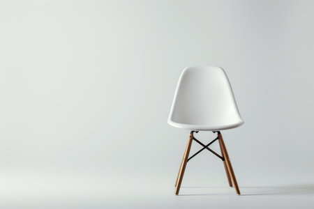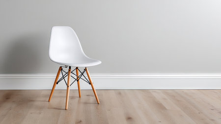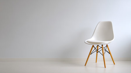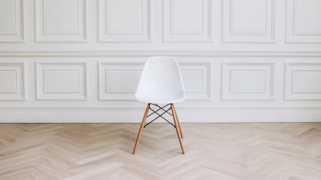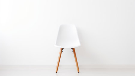 This image features a minimalist white chair with wooden legs set in a bright, uncluttered interior. Ideal for showcasing modern design elements and styles, the chair's sleek lines and simple form provide a fresh and inviting atmosphere perfect for various decor inspirations.