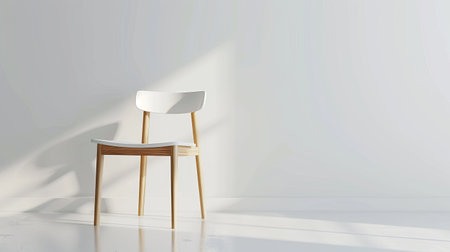 A minimalist white chair with wooden legs sits alone against a light wall, casting elegant shadows that enhance the beauty of modern interior design. Perfect for decor.