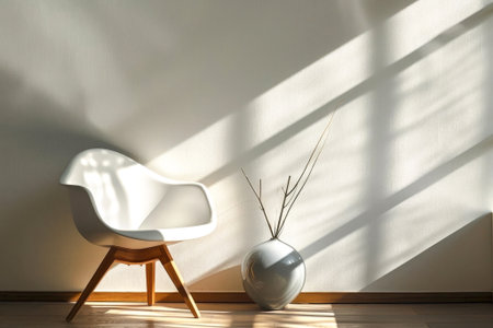 Tranquil minimalism defined. Chic white chair and elegant vase bathed in soft sunlight. This serene space perfectly combines style and simplicity. Generated A.I.