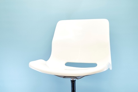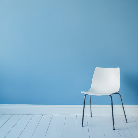 A minimalist setting features a white chair positioned on a light wooden floor with a soft blue wall as the backdrop.