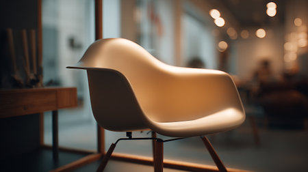 Soft rays of sunlight illuminate a modern chair against a plain wall creating a tranquil atmosphere.