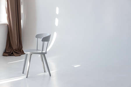 Gray chair stands on a white cyclorama, next to a window with a brown curtain. Copy space