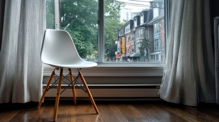 A white modern chair stands near a window, offering a view of a city street and buildings. The scene is bathed in natural light, revealing the chair's design and the textures of the curtains. This image has potential uses in interior design, lifestyle, or architectural projects. The composition and lighting create a sense of calm.