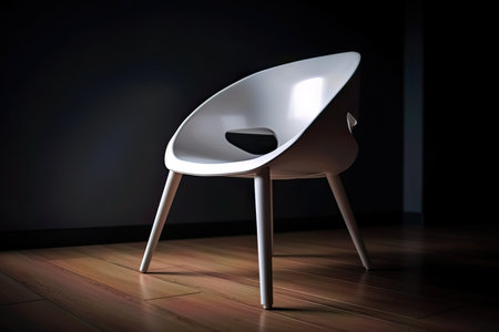 This is a photo of a modern white plastic chair with a curved backrest, set against a dark background. The chair has a contemporary and minimalist design, with a sleek and streamlined appearance. Its curved backrest provides both comfort and style, while the white plastic finish creates a sense of lightness and simplicity.