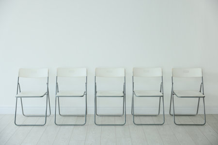 Row of white plastic chairs on metal legs placed on parquet against gray wall