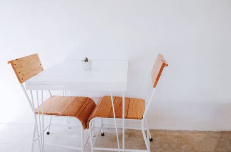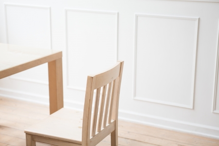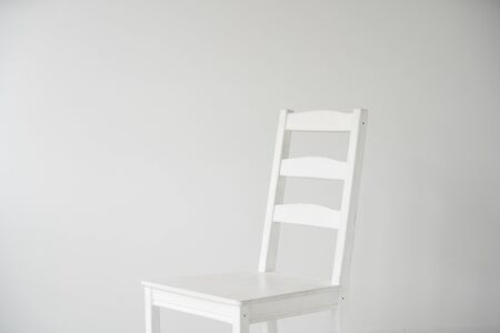 Set of white wooden vintage chairs standing in front of a white wooden wall on light parquet floor.