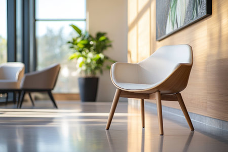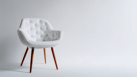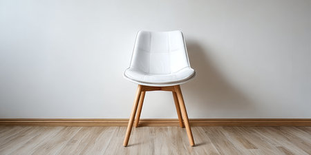 This stock photo features a stylish white chair with wooden legs set in a well-lit, elegant interior space, showcasing minimalism and modern design. Perfect for decor inspiration.