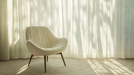 A stunning modern armchair sits elegantly in a bright room adorned with sheer curtains, allowing soft natural light to create a serene atmosphere.