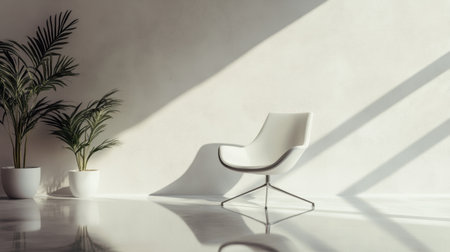 A modern white chair sits elegantly next to lush green plants, casting soft shadows in a sunlit minimalistic interior, creating a calming and serene living space ambiance.