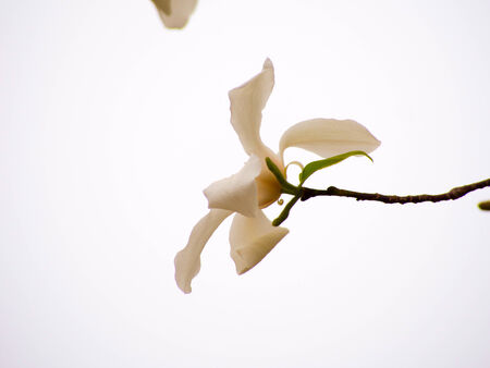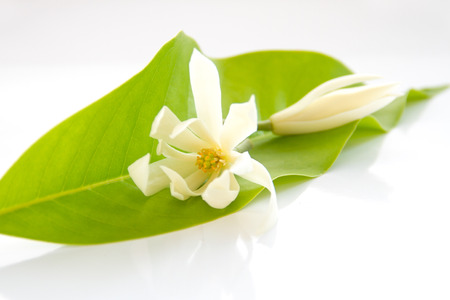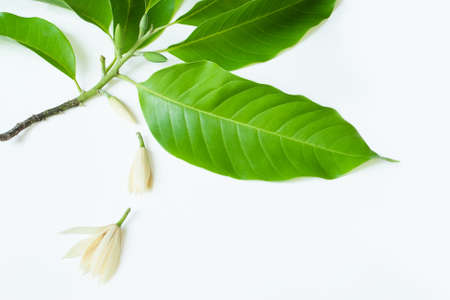 White Champaka flower s with leaves twig and buddings decorate on white paper background