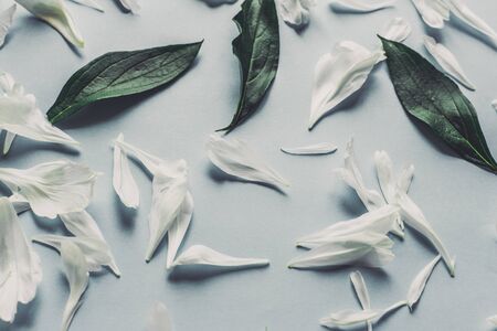 Lone beige white peony on old painted yellow wood grunge background texture.. Flat lay, top view with copy space