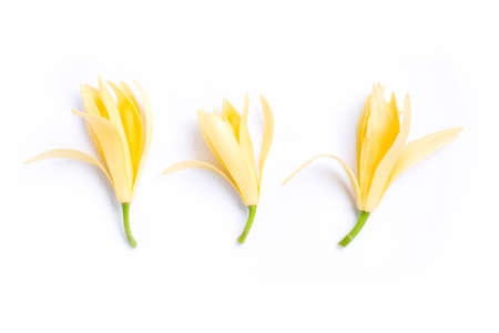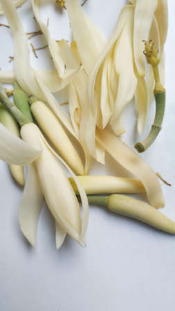 Two yellow colored plucked flowers with leaves on surface with white background. These flowers are called as Michelia champaca also known as sonchampa which are very fragrant flowers used in perfumes.