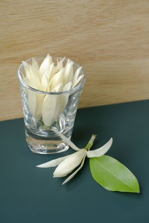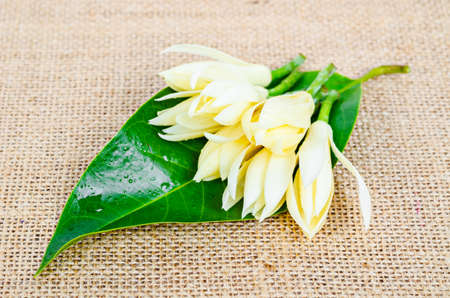 White Champaka are blooming on blue table background. (Michelia alba DC.)
